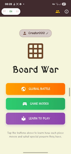 ONLINE: joguei amistosos contra amigos (futuramente) ou contra aleatórios. ou jogue modo Ranqueado (em teste) contra jogadores do mundo todo e suba no ranque mundial, domine o universo Board War.